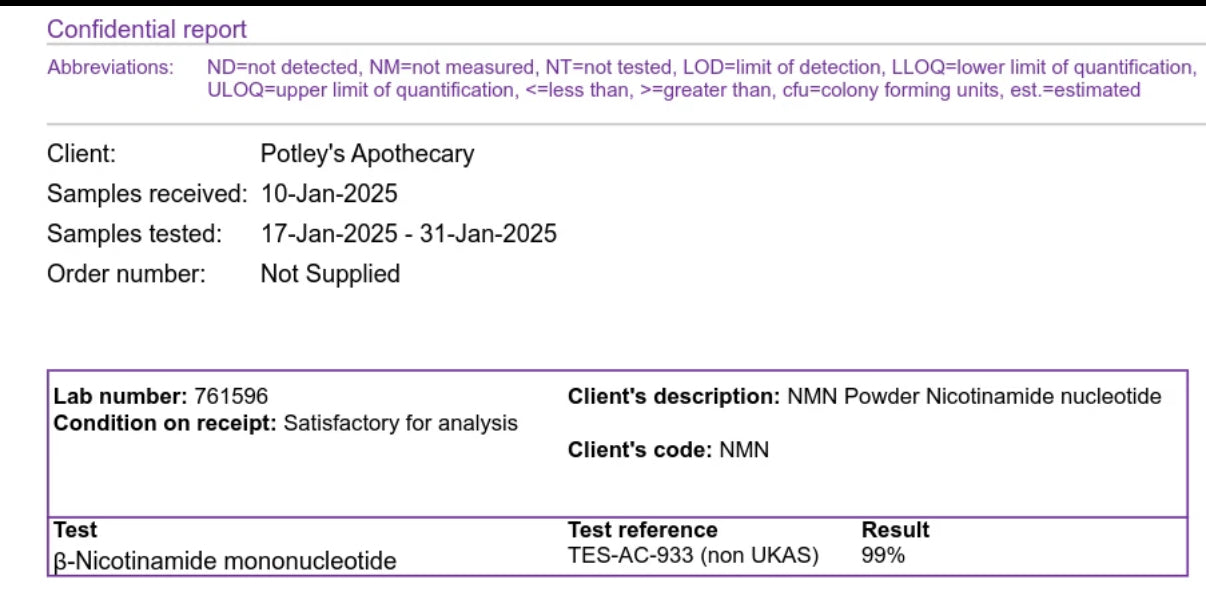 - Third-Party Tested NMN: Our NMN is frequently tested at the only UK-accredited lab capable of verifying its purity and potency. Beware of products without UK test certificates or those relying on untrusted facilities.